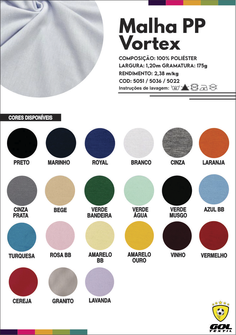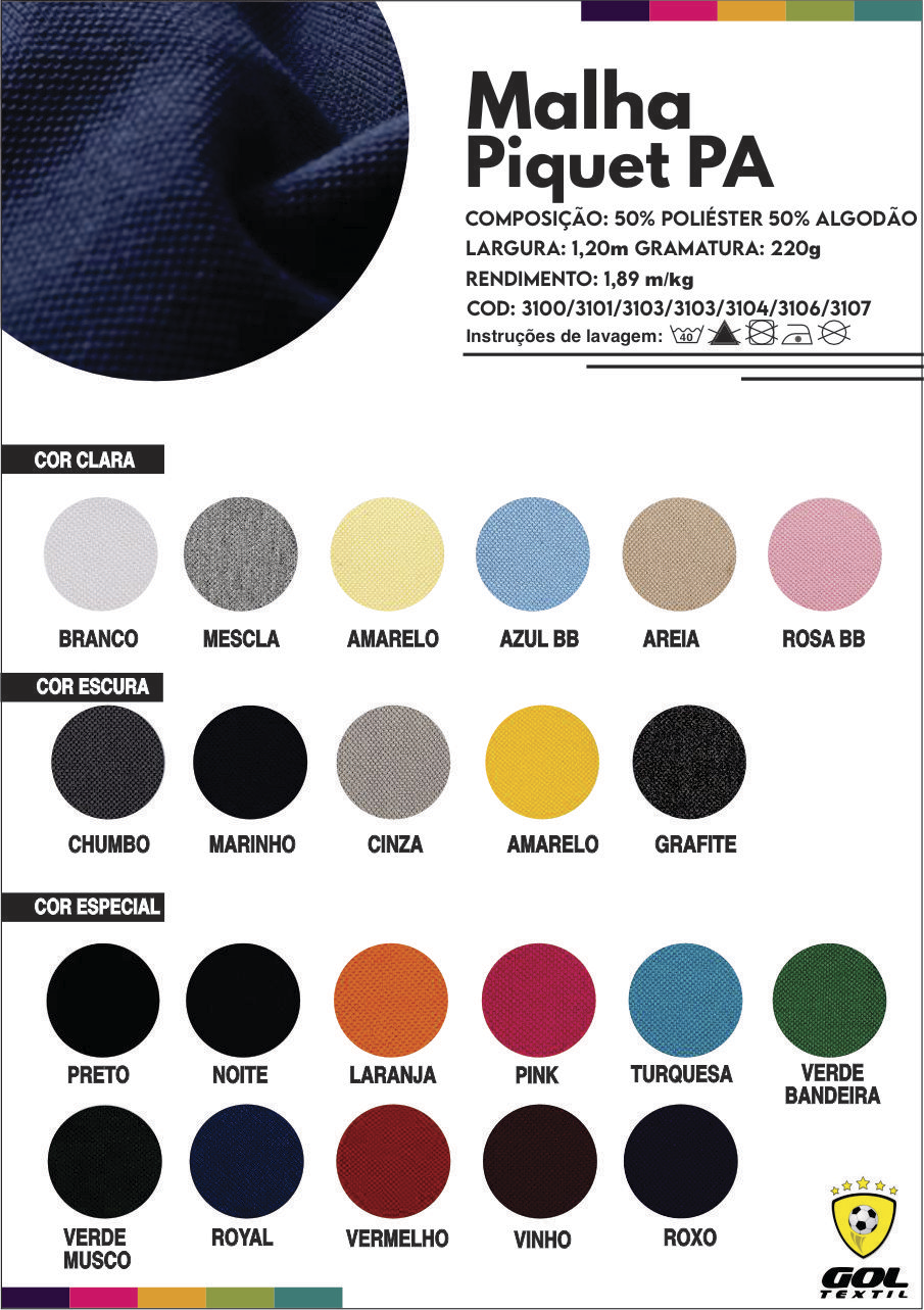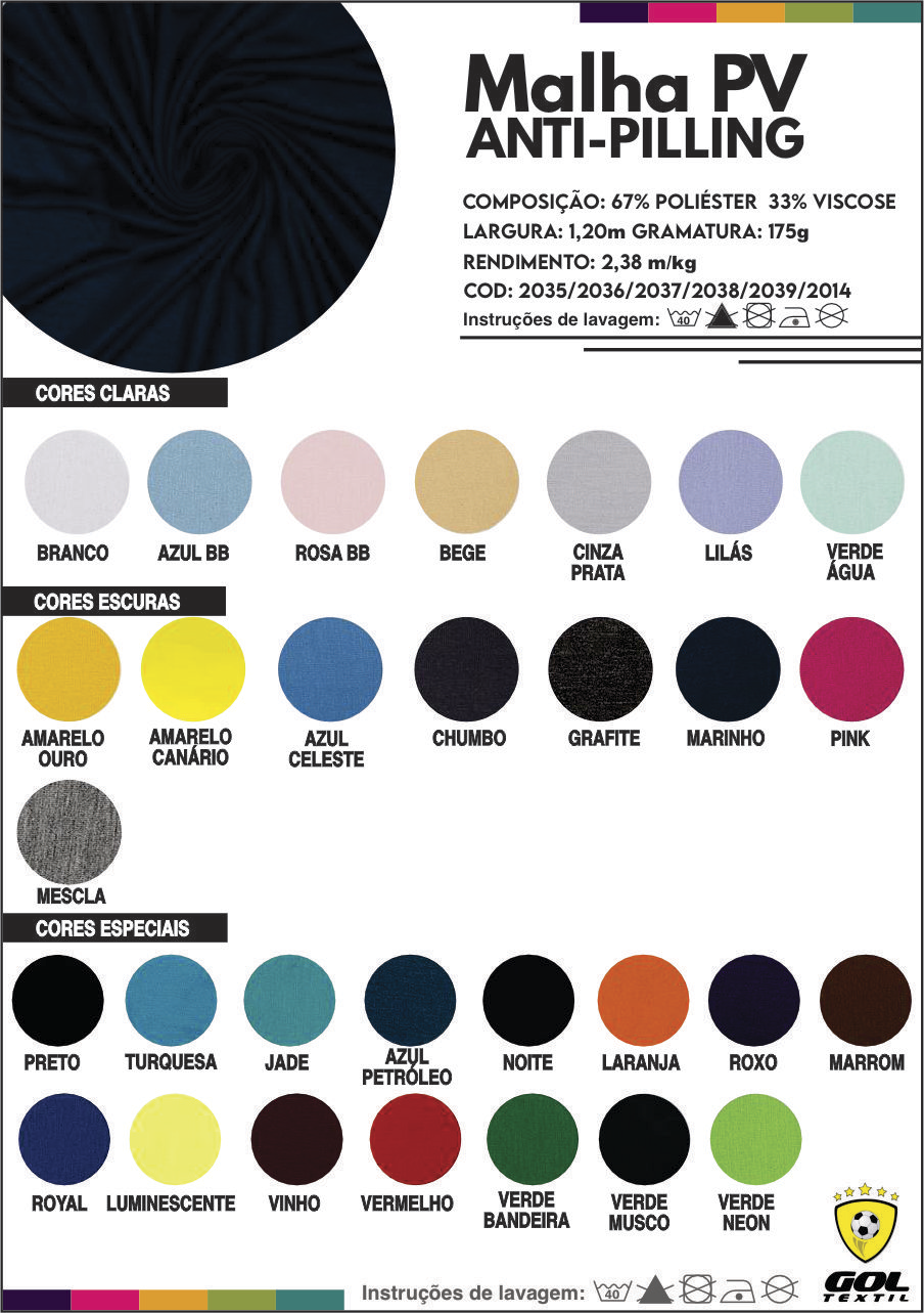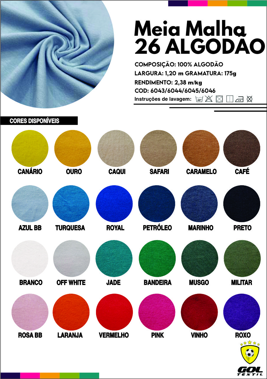 Composição: 100% AlgodãoCódigo: 6039 CORES CLARAS/ 6040 CORES ESCURAS/ 6041 CORES ESPECIAIS/ 6042 BRANCOGramatura: 175 g /m² ±5%Largura: 1,2 m ±5%Rendimento: 2,38 m/kg