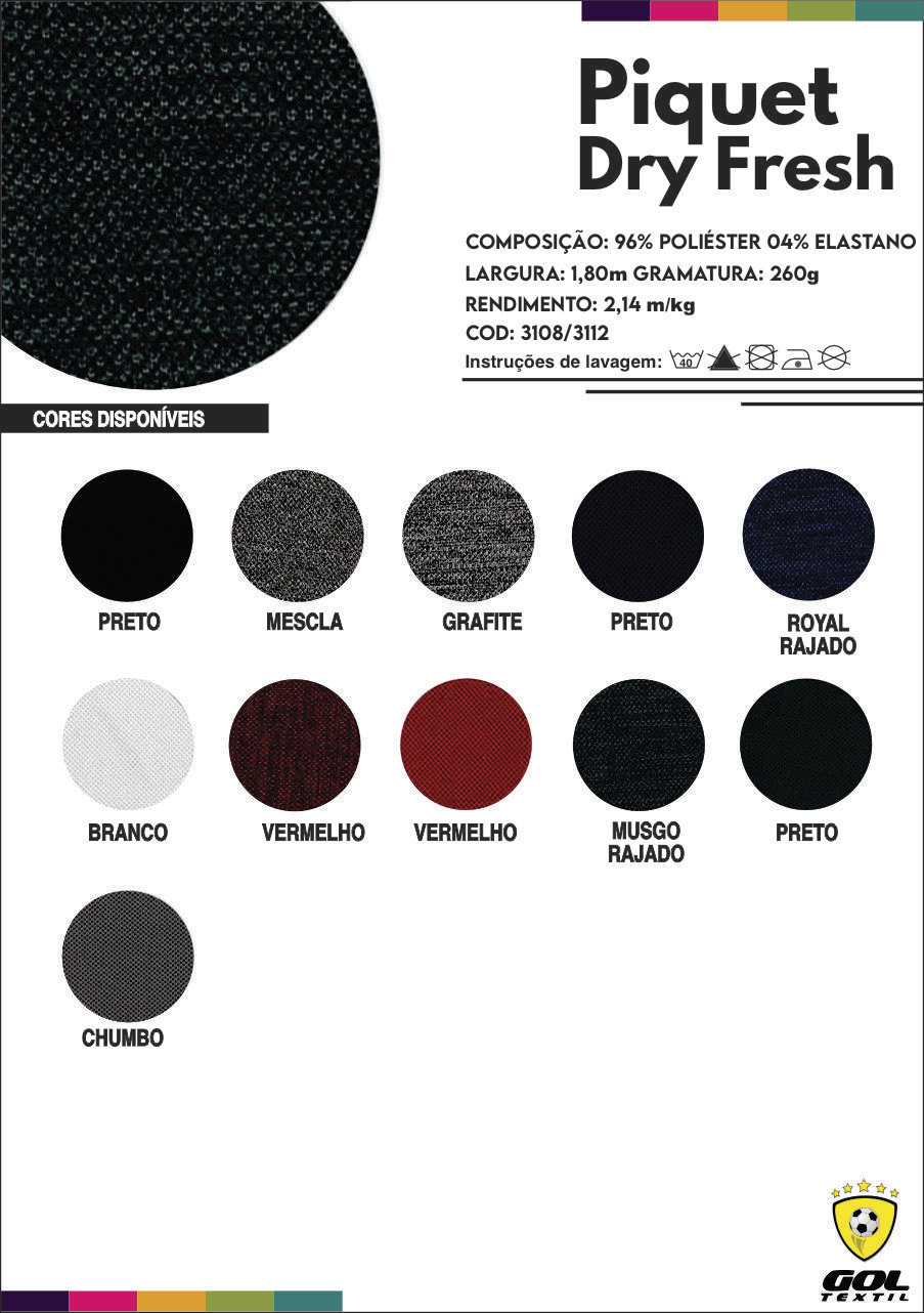 Composição: 96% Poliéster 4% ElastanoCódigo: 3112Gramatura: 260g /m²Largura: ±5%1,8 m ±5%Rendimento: 2,14 m/kg